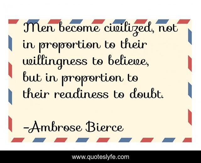 This page presents the quote "Men become civilized, not in proportion to their willingness to believe, but in proportion to their readiness to doubt.". Author of this quote is Ambrose Bierce. This quote is about become, believe, doubt,.