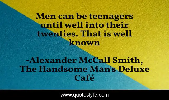 This page presents the quote "Men can be teenagers until well into their twenties. That is well known". Author of this quote is Alexander McCall Smith, The Handsome Man's Deluxe Café. This quote is about men, teenagers,.