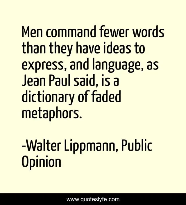 This page presents the quote "Men command fewer words than they have ideas to express, and language, as Jean Paul said, is a dictionary of faded metaphors.". Author of this quote is Walter Lippmann, Public Opinion. .