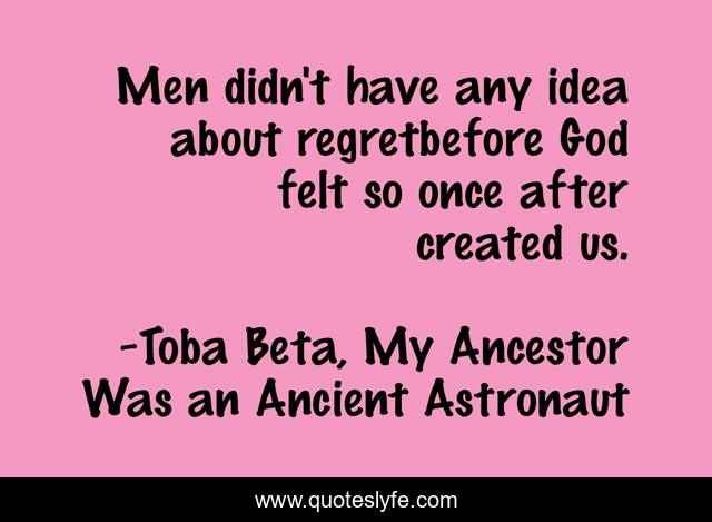This page presents the quote "Men didn't have any idea about regretbefore God felt so once after created us.". Author of this quote is Toba Beta, My Ancestor Was an Ancient Astronaut. This quote is about god, deed, regret,.
