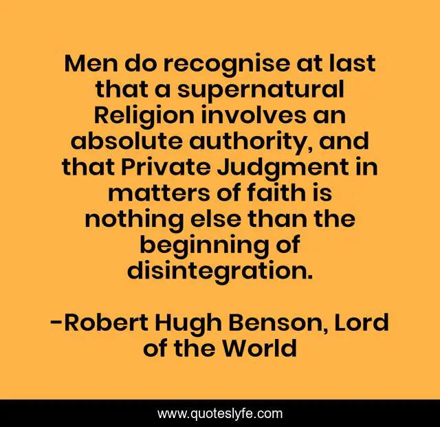 This page presents the quote "Men do recognise at last that a supernatural Religion involves an absolute authority, and that Private Judgment in matters of faith is nothing else than the beginning of disintegration.". Author of this quote is Robert Hugh Benson, Lord of the World. This quote is about faith, religious-beliefs, authority,.
