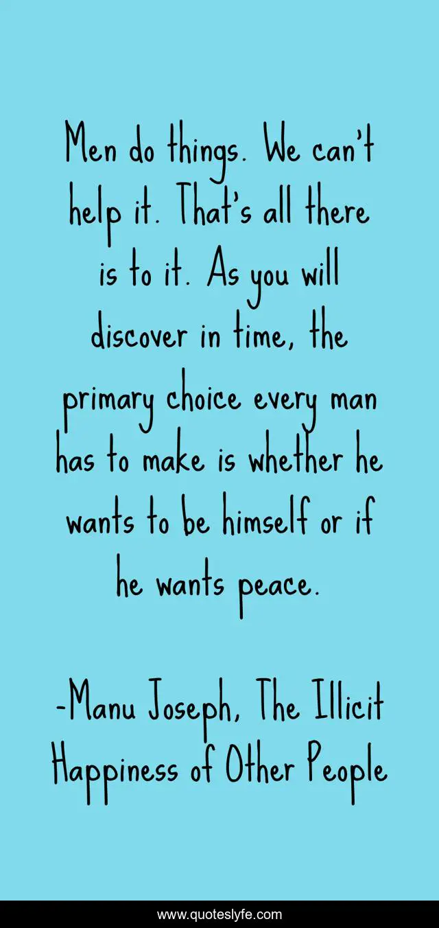 This page presents the quote "Men do things. We can't help it. That's all there is to it. As you will discover in time, the primary choice every man has to make is whether he wants to be himself or if he wants peace.". Author of this quote is Manu Joseph, The Illicit Happiness of Other People. This quote is about life, men,.