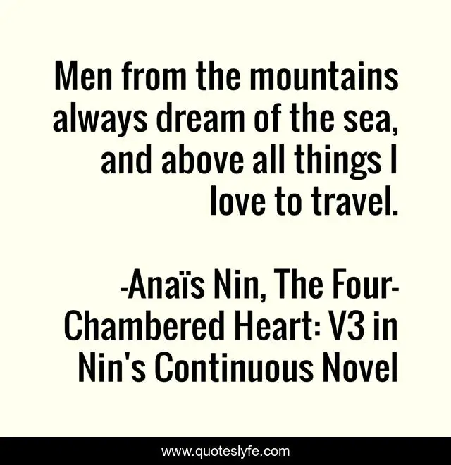 This page presents the quote "Men from the mountains always dream of the sea, and above all things I love to travel.". Author of this quote is Anaïs Nin, The Four-Chambered Heart: V3 in Nin's Continuous Novel. This quote is about anais-nin, books, book,.