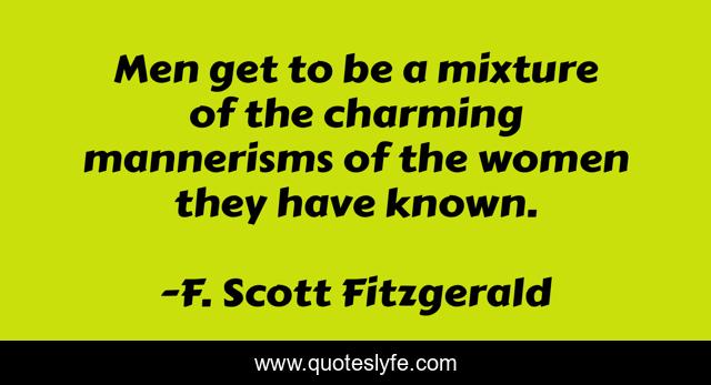 This page presents the quote "Men get to be a mixture of the charming mannerisms of the women they have known.". Author of this quote is F. Scott Fitzgerald. This quote is about mixture, men, charming,.