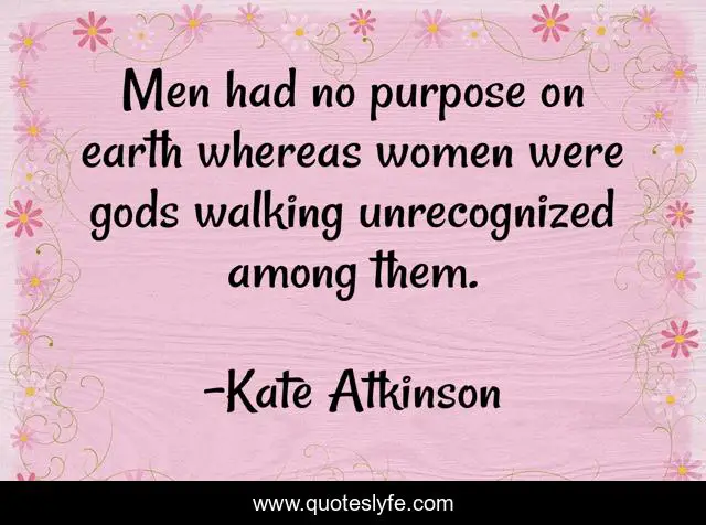 This page presents the quote "Men had no purpose on earth whereas women were gods walking unrecognized among them.". Author of this quote is Kate Atkinson. This quote is about atkinson, men, gods, jackson-brodie, women,.