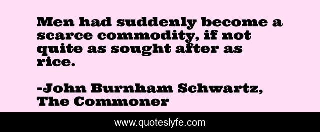 This page presents the quote "Men had suddenly become a scarce commodity, if not quite as sought after as rice.". Author of this quote is John Burnham Schwartz, The Commoner. This quote is about love, schwartz, men, the-commoner, scarcity, affection,.