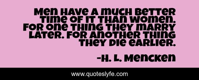 This page presents the quote "Men have a much better time of it than women. For one thing they marry later. For another thing they die earlier.". Author of this quote is H. L. Mencken. .