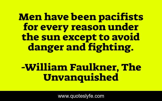 This page presents the quote "Men have been pacifists for every reason under the sun except to avoid danger and fighting.". Author of this quote is William Faulkner, The Unvanquished. This quote is about fighting, men, war, pacifism, pacifists,.