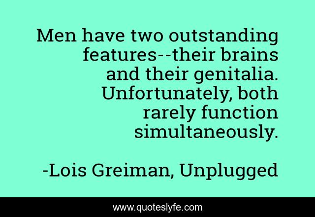 This page presents the quote "Men have two outstanding features--their brains and their genitalia. Unfortunately, both rarely function simultaneously.". Author of this quote is Lois Greiman, Unplugged. This quote is about mystery, chick-lit, humor,.