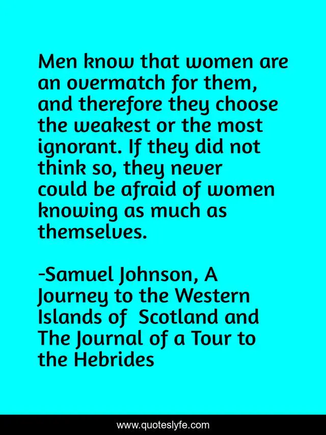 This page presents the quote "Men know that women are an overmatch for them, and therefore they choose the weakest or the most ignorant. If they did not think so, they never could be afraid of women knowing as much as themselves.". Author of this quote is Samuel Johnson, A Journey to the Western Islands of Scotland and The Journal of a Tour to the Hebrides. This quote is about abilities, equality, skills, weakness, men, misogyny, superiority, suppression, gender,.