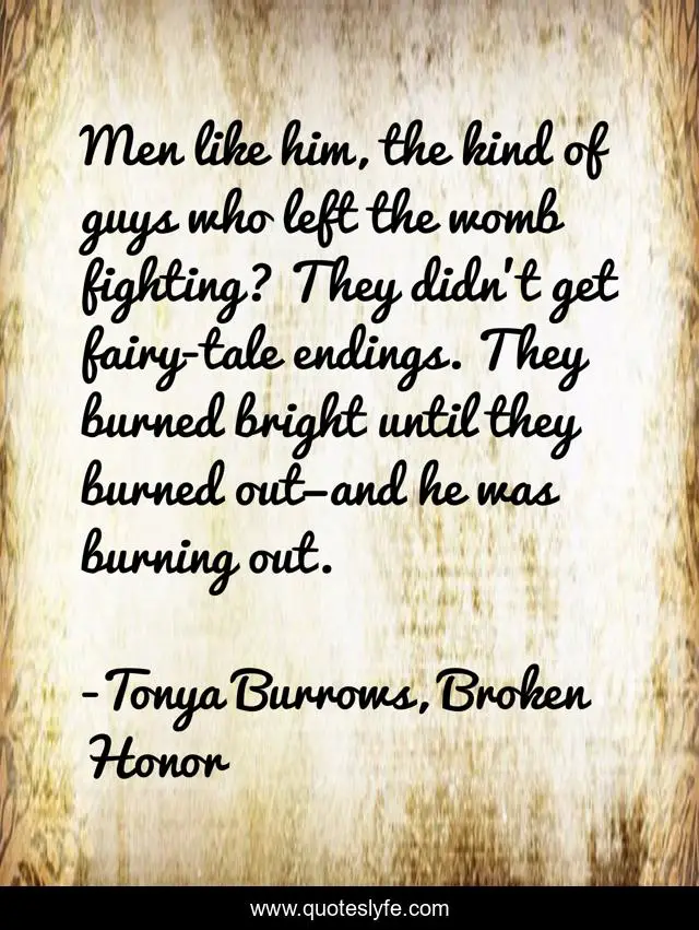 This page presents the quote "Men like him, the kind of guys who left the womb fighting? They didn’t get fairy-tale endings. They burned bright until they burned out—and he was burning out.". Author of this quote is Tonya Burrows, Broken Honor. This quote is about military-romance, broken-honor, romantic-suspense,.