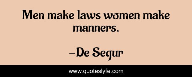 This page presents the quote "Men make laws women make manners.". Author of this quote is De Segur. .