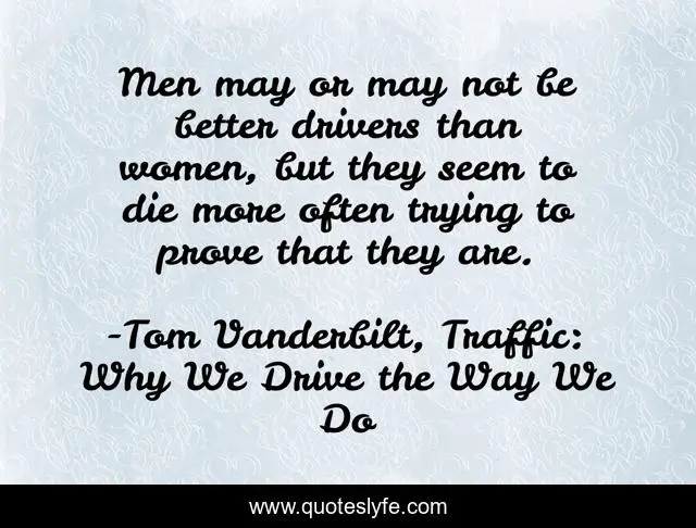 This page presents the quote "Men may or may not be better drivers than women, but they seem to die more often trying to prove that they are.". Author of this quote is Tom Vanderbilt, Traffic: Why We Drive the Way We Do. This quote is about roads, cars, aggression, driving, gender,.