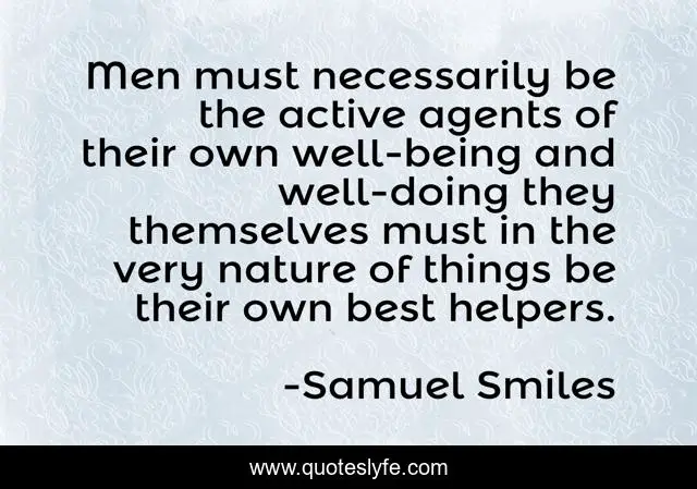 This page presents the quote "Men must necessarily be the active agents of their own well-being and well-doing they themselves must in the very nature of things be their own best helpers.". Author of this quote is Samuel Smiles. This quote is about men, well-being, best,.