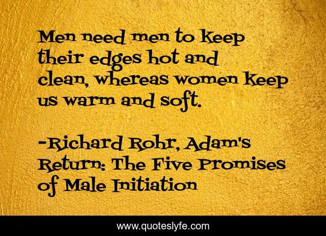 This page presents the quote "Men need men to keep their edges hot and clean, whereas women keep us warm and soft.". Author of this quote is Richard Rohr, Adam's Return: The Five Promises of Male Initiation. This quote is about discipleship, assertiveness, masculinity, accountability,.
