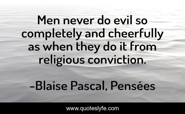 This page presents the quote "Men never do evil so completely and cheerfully as when they do it from religious conviction.". Author of this quote is Blaise Pascal, Pensées. This quote is about evil, religious-conviction,.