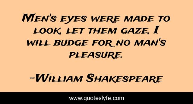 This page presents the quote "Men's eyes were made to look, let them gaze, I will budge for no man's pleasure.". Author of this quote is William Shakespeare. This quote is about romance, love, affection,.