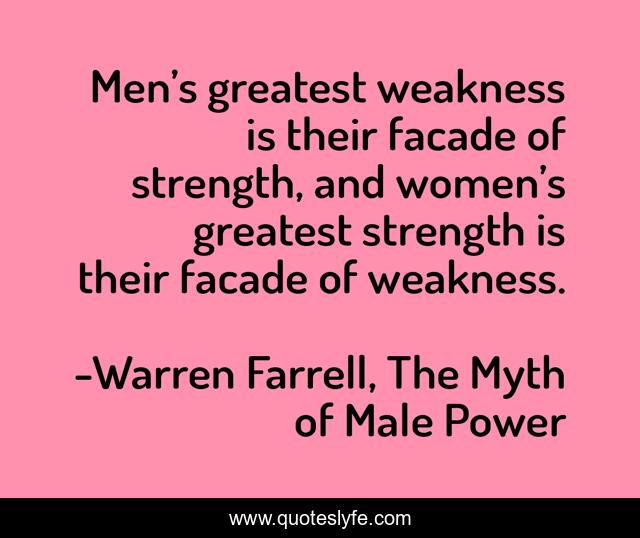 This page presents the quote "Men’s greatest weakness is their facade of strength, and women’s greatest strength is their facade of weakness.". Author of this quote is Warren Farrell, The Myth of Male Power. This quote is about equality, men, men-s-rights, mra, feminism, women,.