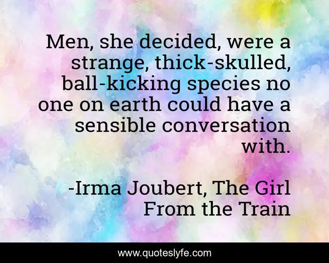 This page presents the quote "Men, she decided, were a strange, thick-skulled, ball-kicking species no one on earth could have a sensible conversation with.". Author of this quote is Irma Joubert, The Girl From the Train. This quote is about men, humor,.