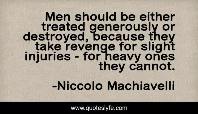This page presents the quote "Men should be either treated generously or destroyed, because they take revenge for slight injuries - for heavy ones they cannot.". Author of this quote is Niccolo Machiavelli. This quote is about revenge, injuries,.