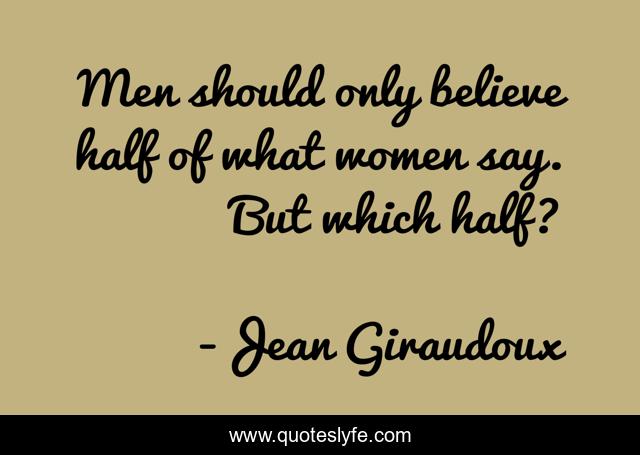 This page presents the quote "Men should only believe half of what women say. But which half?". Author of this quote is Jean Giraudoux. This quote is about believe, men, women,.