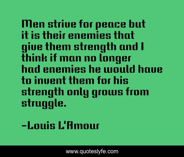 This page presents the quote "Men strive for peace but it is their enemies that give them strength and I think if man no longer had enemies he would have to invent them for his strength only grows from struggle.". Author of this quote is Louis L'Amour. .