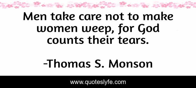 This page presents the quote "Men take care not to make women weep, for God counts their tears.". Author of this quote is Thomas S. Monson. This quote is about religion, inspirational, enthusiasm,.