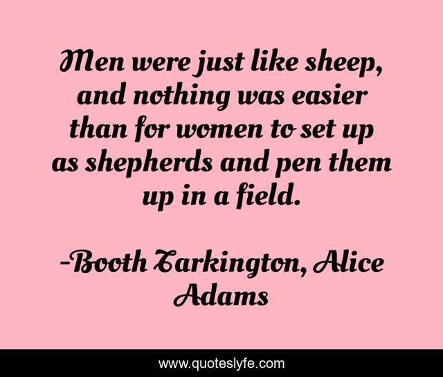 This page presents the quote "Men were just like sheep, and nothing was easier than for women to set up as shepherds and pen them up in a field.". Author of this quote is Booth Tarkington, Alice Adams. This quote is about sheep, men, men-and-women,.