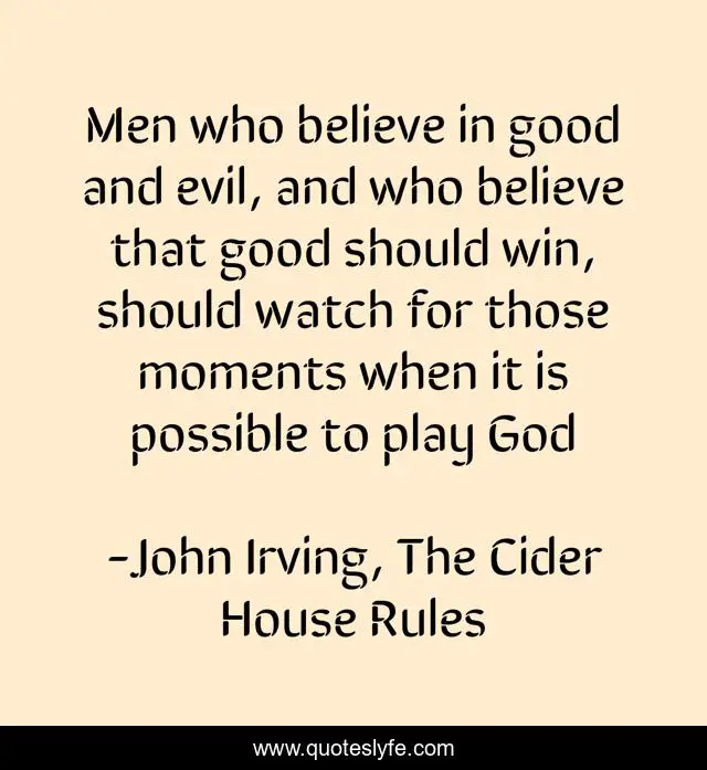 This page presents the quote "Men who believe in good and evil, and who believe that good should win, should watch for those moments when it is possible to play God". Author of this quote is John Irving, The Cider House Rules. .
