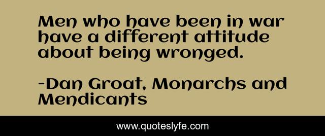This page presents the quote "Men who have been in war have a different attitude about being wronged.". Author of this quote is Dan Groat, Monarchs and Mendicants. This quote is about wronged, warriors, attitude, behaviour, wrong, wrongdoing, attitude-toward-life, soldiers, war,.