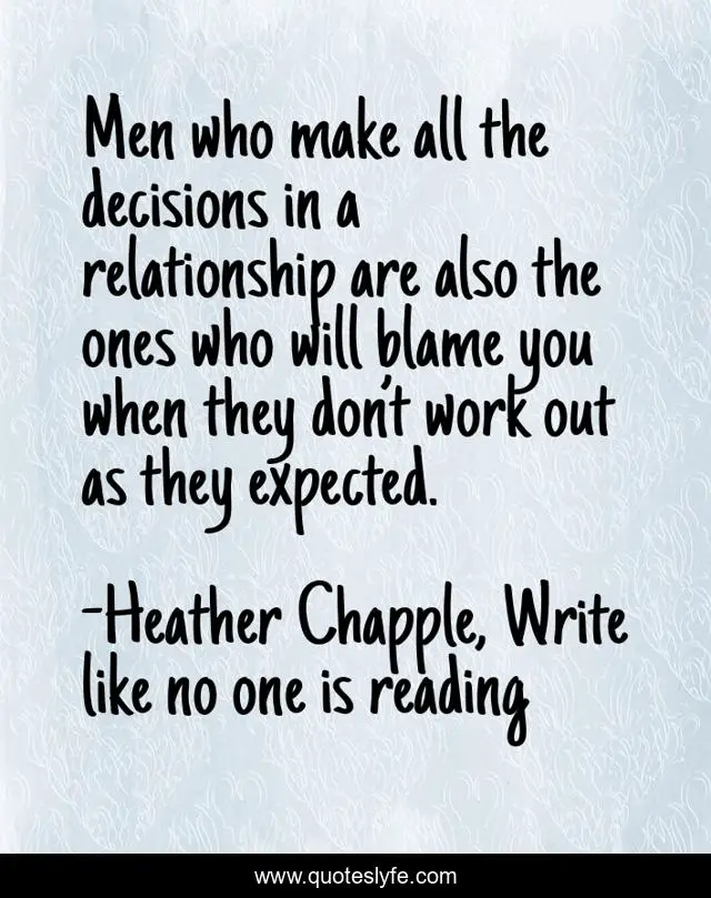 This page presents the quote "Men who make all the decisions in a relationship are also the ones who will blame you when they don’t work out as they expected.". Author of this quote is Heather Chapple, Write like no one is reading. This quote is about relationships, lost-love, over, blame, failed-relationships, heartbreak, work-out, exes, decisions,.