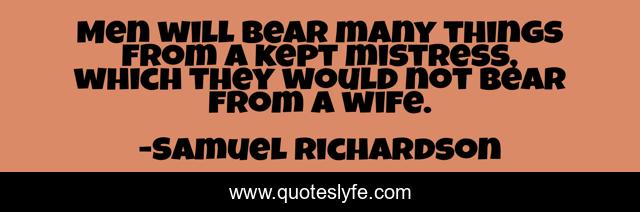 This page presents the quote "Men will bear many things from a kept mistress, which they would not bear from a wife.". Author of this quote is Samuel Richardson. This quote is about mistress, wife,.