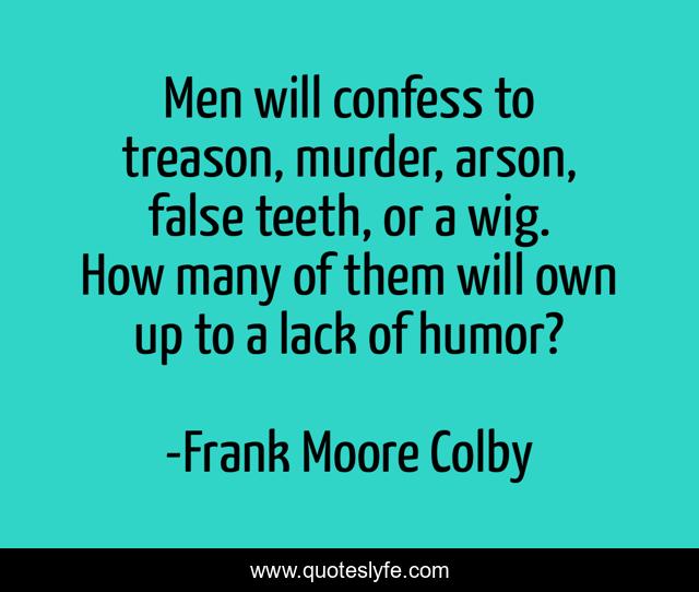 This page presents the quote "Men will confess to treason, murder, arson, false teeth, or a wig. How many of them will own up to a lack of humor?". Author of this quote is Frank Moore Colby. This quote is about men, teeth,.