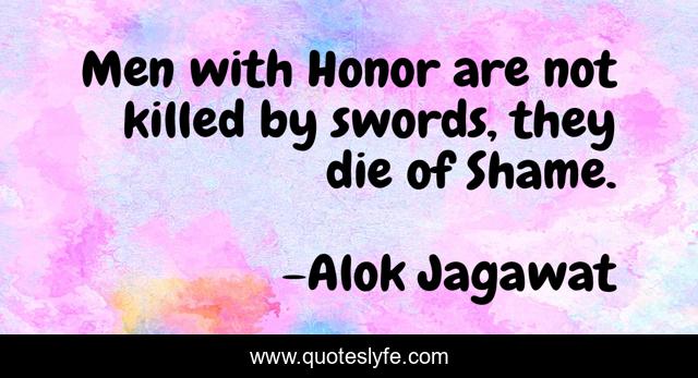 This page presents the quote "Men with Honor are not killed by swords, they die of Shame.". Author of this quote is Alok Jagawat. This quote is about shame, courage, honor, men,.