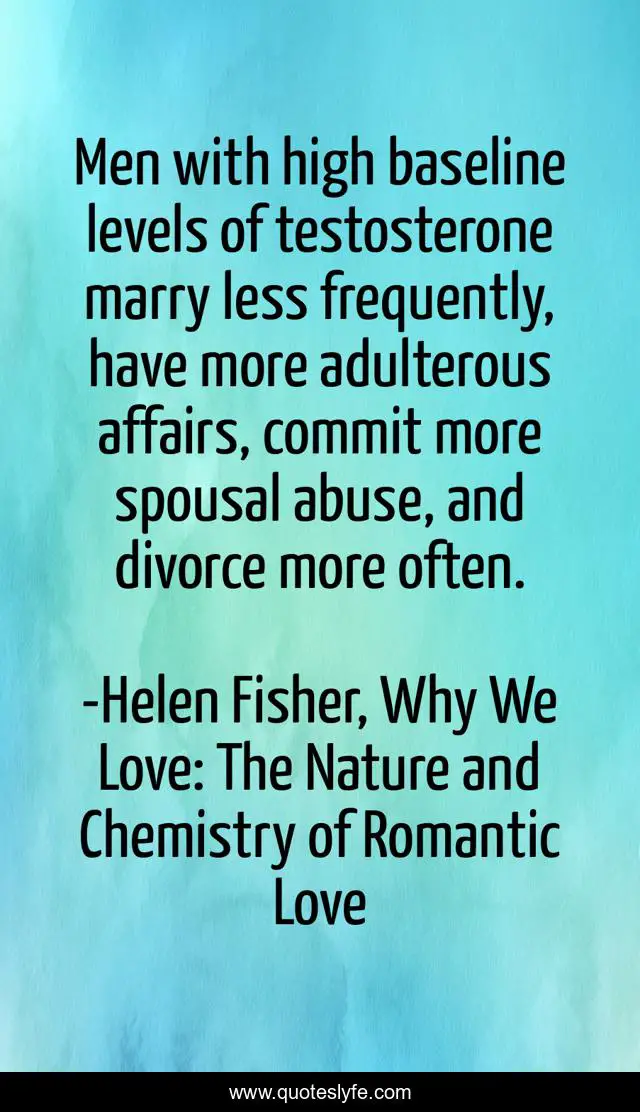 This page presents the quote "Men with high baseline levels of testosterone marry less frequently, have more adulterous affairs, commit more spousal abuse, and divorce more often.". Author of this quote is Helen Fisher, Why We Love: The Nature and Chemistry of Romantic Love. This quote is about abuse, love, testosterone, affection,.