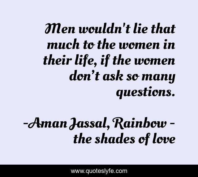This page presents the quote "Men wouldn't lie that much to the women in their life, if the women don’t ask so many questions.". Author of this quote is Aman Jassal, Rainbow - the shades of love. This quote is about lie, life, woman, life-lessons, men, question, lies, questions, man,.
