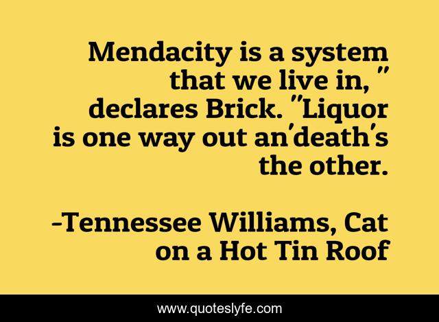 This page presents the quote "Mendacity is a system that we live in, " declares Brick. "Liquor is one way out an'death's the other.". Author of this quote is Tennessee Williams, Cat on a Hot Tin Roof. This quote is about death, father, alcoholism,.