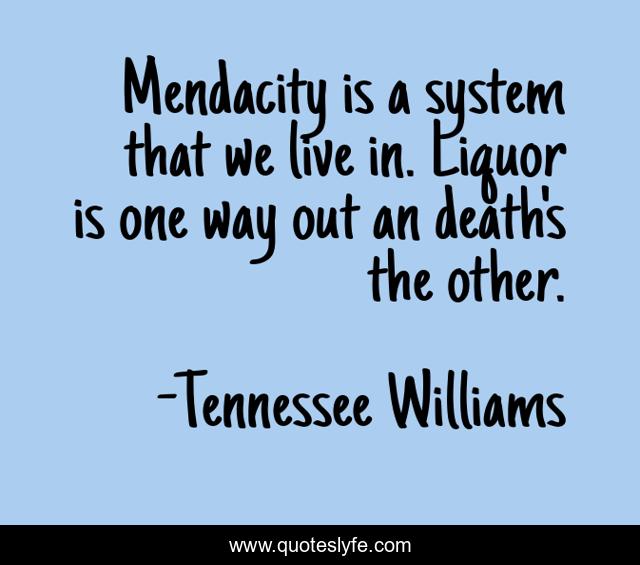 This page presents the quote "Mendacity is a system that we live in. Liquor is one way out an death's the other.". Author of this quote is Tennessee Williams. This quote is about live, system, way,.