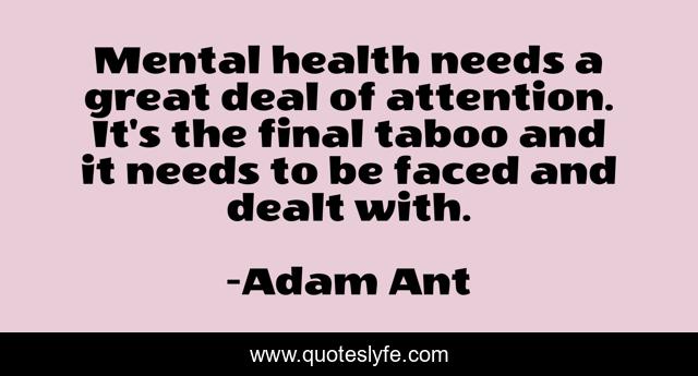 This page presents the quote "Mental health needs a great deal of attention. It's the final taboo and it needs to be faced and dealt with.". Author of this quote is Adam Ant. This quote is about mental health, health,.