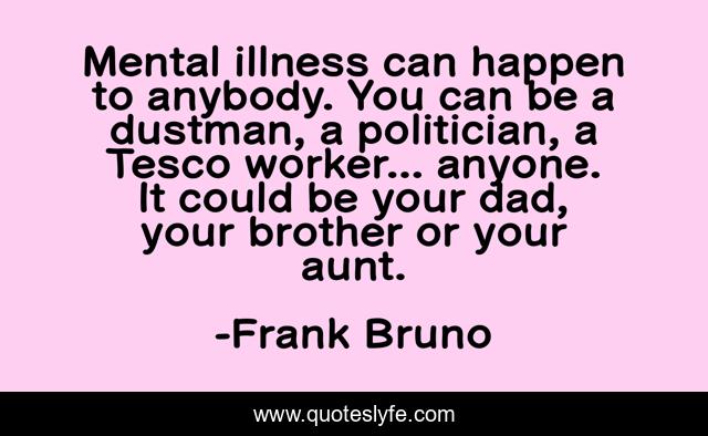 This page presents the quote "Mental illness can happen to anybody. You can be a dustman, a politician, a Tesco worker... anyone. It could be your dad, your brother or your aunt.". Author of this quote is Frank Bruno. This quote is about mental illness, brother,.