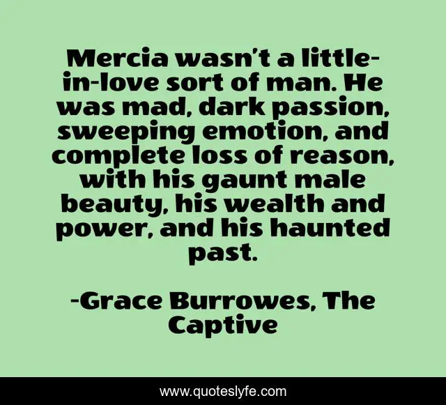 This page presents the quote "Mercia wasn’t a little-in-love sort of man. He was mad, dark passion, sweeping emotion, and complete loss of reason, with his gaunt male beauty, his wealth and power, and his haunted past.". Author of this quote is Grace Burrowes, The Captive. .