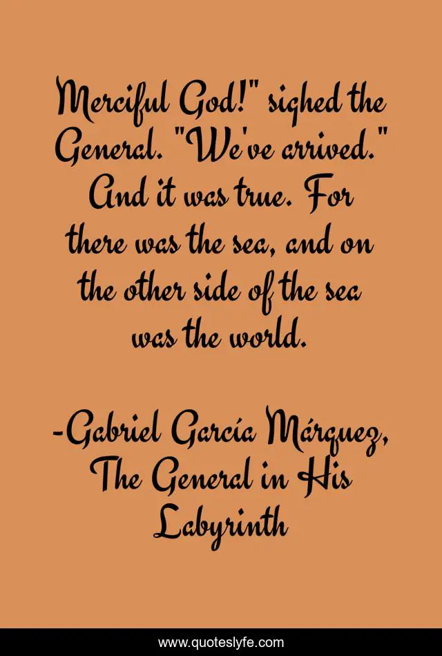This page presents the quote "Merciful God!" sighed the General. "We've arrived." And it was true. For there was the sea, and on the other side of the sea was the world.". Author of this quote is Gabriel García Márquez, The General in His Labyrinth. This quote is about adventure, sea,.