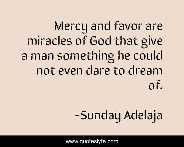 This page presents the quote "Mercy and favor are miracles of God that give a man something he could not even dare to dream of.". Author of this quote is Sunday Adelaja. This quote is about miracles, favor, dream, dare, mercy,.