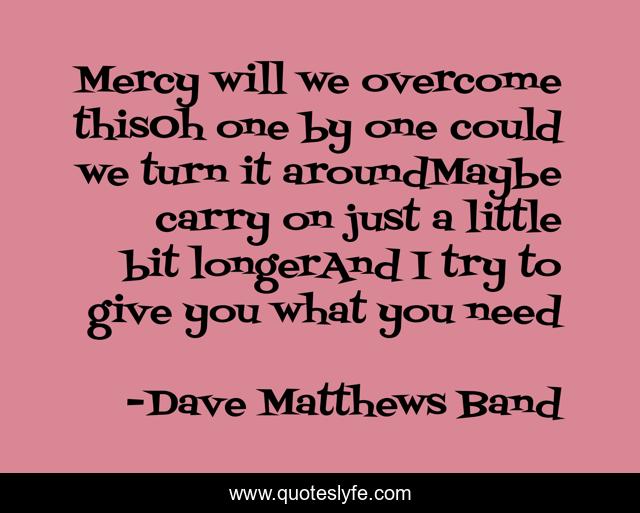 This page presents the quote "Mercy will we overcome thisOh one by one could we turn it aroundMaybe carry on just a little bit longerAnd I try to give you what you need". Author of this quote is Dave Matthews Band. This quote is about world-affairs, mercy,.