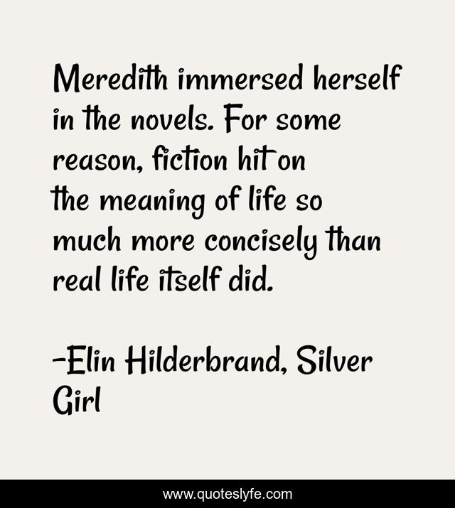 This page presents the quote "Meredith immersed herself in the novels. For some reason, fiction hit on the meaning of life so much more concisely than real life itself did.". Author of this quote is Elin Hilderbrand, Silver Girl. This quote is about meaning-of-life, self-awareness, novels, fiction, self-realization, books, escape, reading,.
