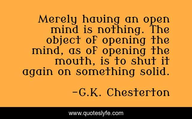This page presents the quote "Merely having an open mind is nothing. The object of opening the mind, as of opening the mouth, is to shut it again on something solid.". Author of this quote is G.K. Chesterton. .