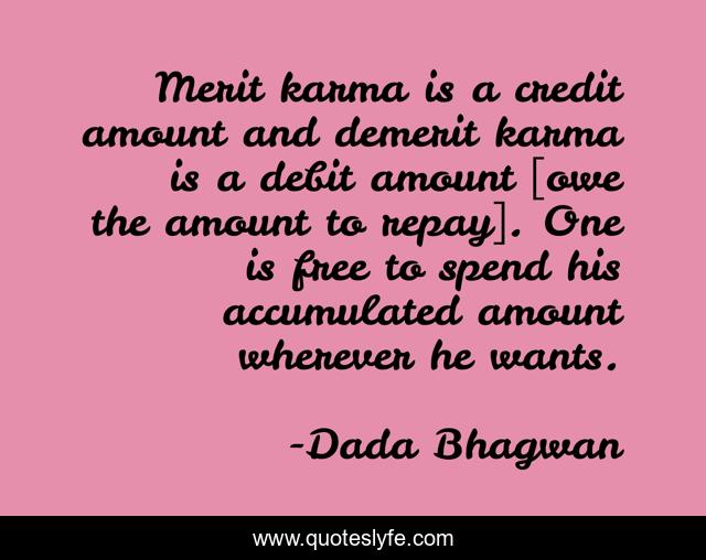 This page presents the quote "Merit karma is a credit amount and demerit karma is a debit amount [owe the amount to repay]. One is free to spend his accumulated amount wherever he wants.". Author of this quote is Dada Bhagwan. This quote is about repay, credit-amont, debit-amount, spiritual,.