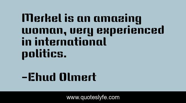 This page presents the quote "Merkel is an amazing woman, very experienced in international politics.". Author of this quote is Ehud Olmert. This quote is about politics, woman,.