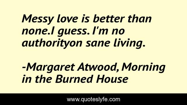 This page presents the quote "Messy love is better than none.I guess. I'm no authorityon sane living.". Author of this quote is Margaret Atwood, Morning in the Burned House. This quote is about love, messy-love, jealousy, sanity, passion, affection,.