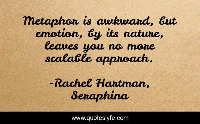 This page presents the quote "Metaphor is awkward, but emotion, by its nature, leaves you no more scalable approach.". Author of this quote is Rachel Hartman, Seraphina. This quote is about emotions, metaphors,.